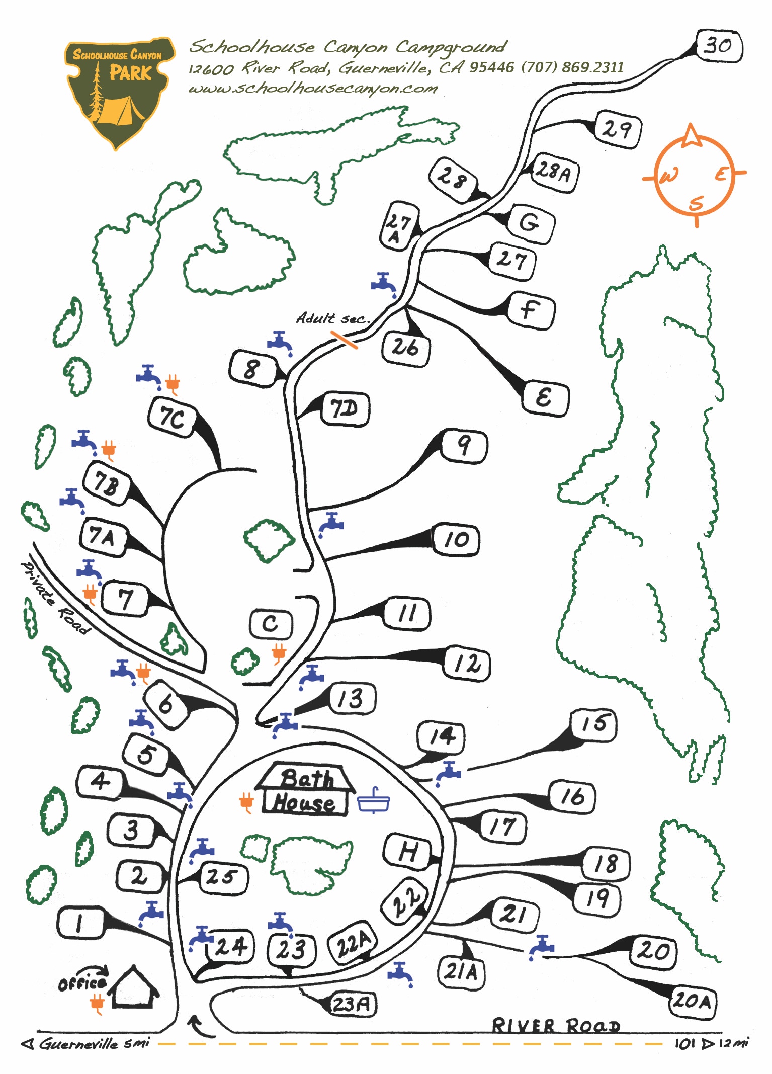 There is even a site in the adult section which has a secret spot to hide your tent up the hill looking out over the the other campers in privacy. While we are primarily a tent campground, a few of the sites work well for small RVs or trailer. Please come for a visit. Make memories with your family and loved ones that will last a lifetime. Choose your own favorite Schoolhouse Canyon campsite!