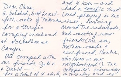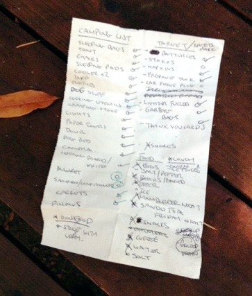 One of the campers of last summer left behind this camping list. Corina found it in a campsite and took a picture. I love this. Its so personal and organized. It makes me smile to think about all the things this family had to plan and do just to come camping at Schoolhouse.